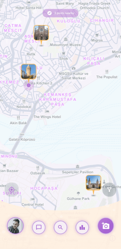 Capture and share moments with photos or short videos. Every post is pinned to the location where it happened.