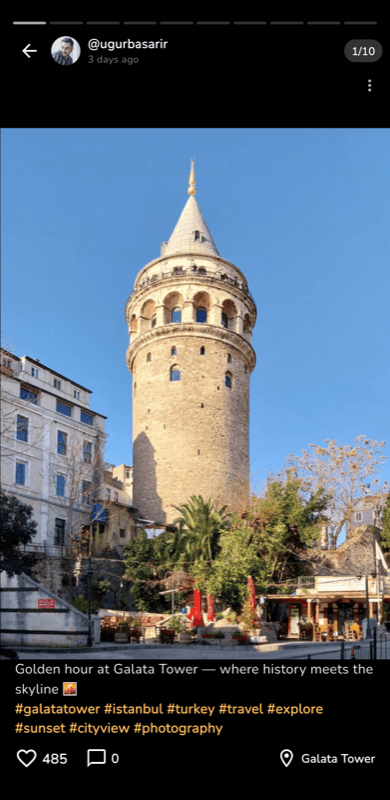 Take a photo or video, pick a category, add a caption with #tags, and share it at your location.