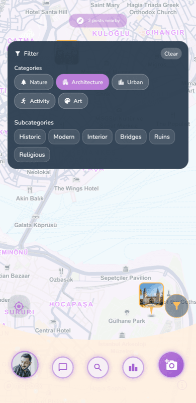 Organize posts by categories like Nature, Architecture, Urban, Activity and Art. Filter the map to find exactly what you're looking for.